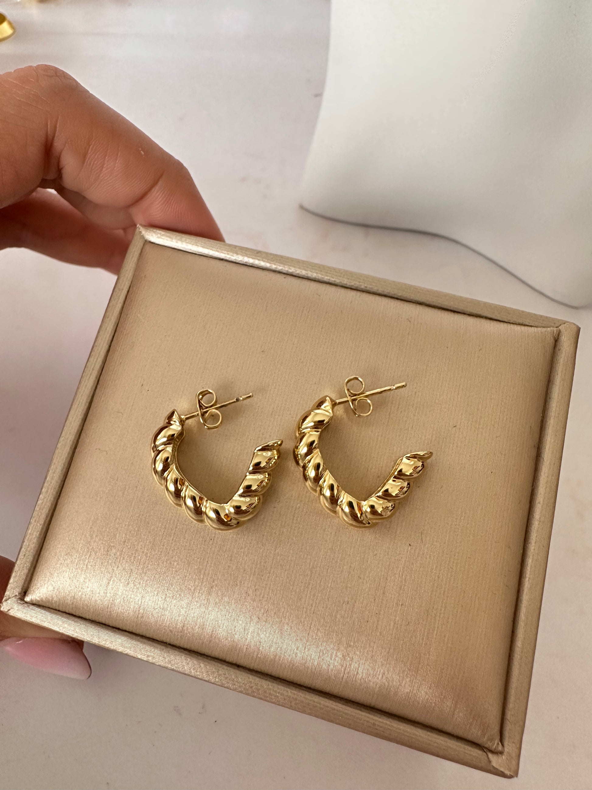 💫 Con forma de medio Corazón, en color dorado, y tamaño pequeño, estos aretes destacan por su diseño moderno y versátil. Disponible para entrega inmediata, son ideales para usar a diario o en ocasiones especiales.