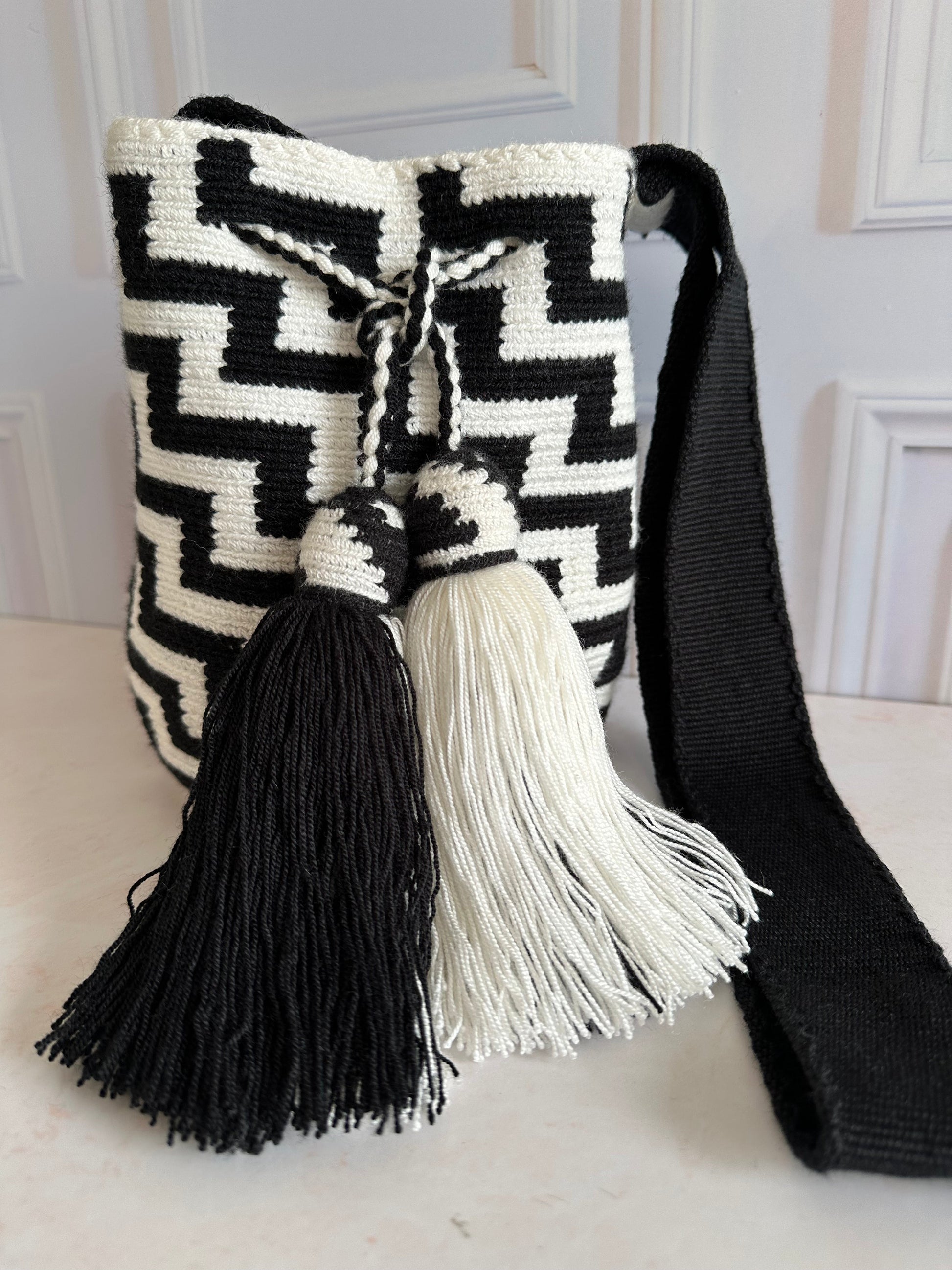 Mochila wayuu mediana de colección, tejida a mano con hilos wayuu de alta calidad que destacan por su resistencia y suavidad.